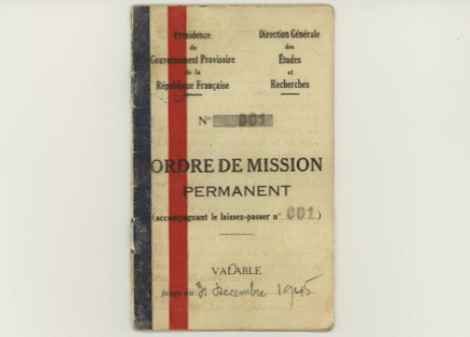 « Monsieur le Capitaine Vet de la Direction générale des Études et Recherches, contrôle général Nord-Ouest, est en mission permanente pour le compte du Président du Gouvernement Provisoire de la République Française chef des Armées.